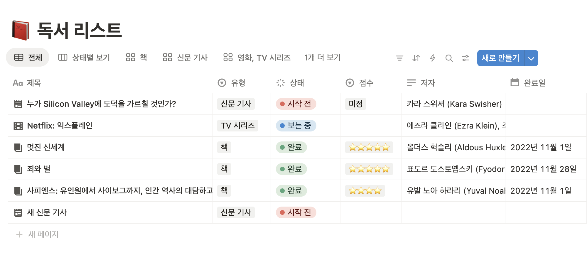 노션 기본 제공 독서 리스트(Reading List)가 좋은 예시입니다. 책 제목, 저자, 읽기 상태 같은 속성이 이미 구성되어 있어 “표 기반 기록” 감각을 빠르게 익힐 수 있습니다.