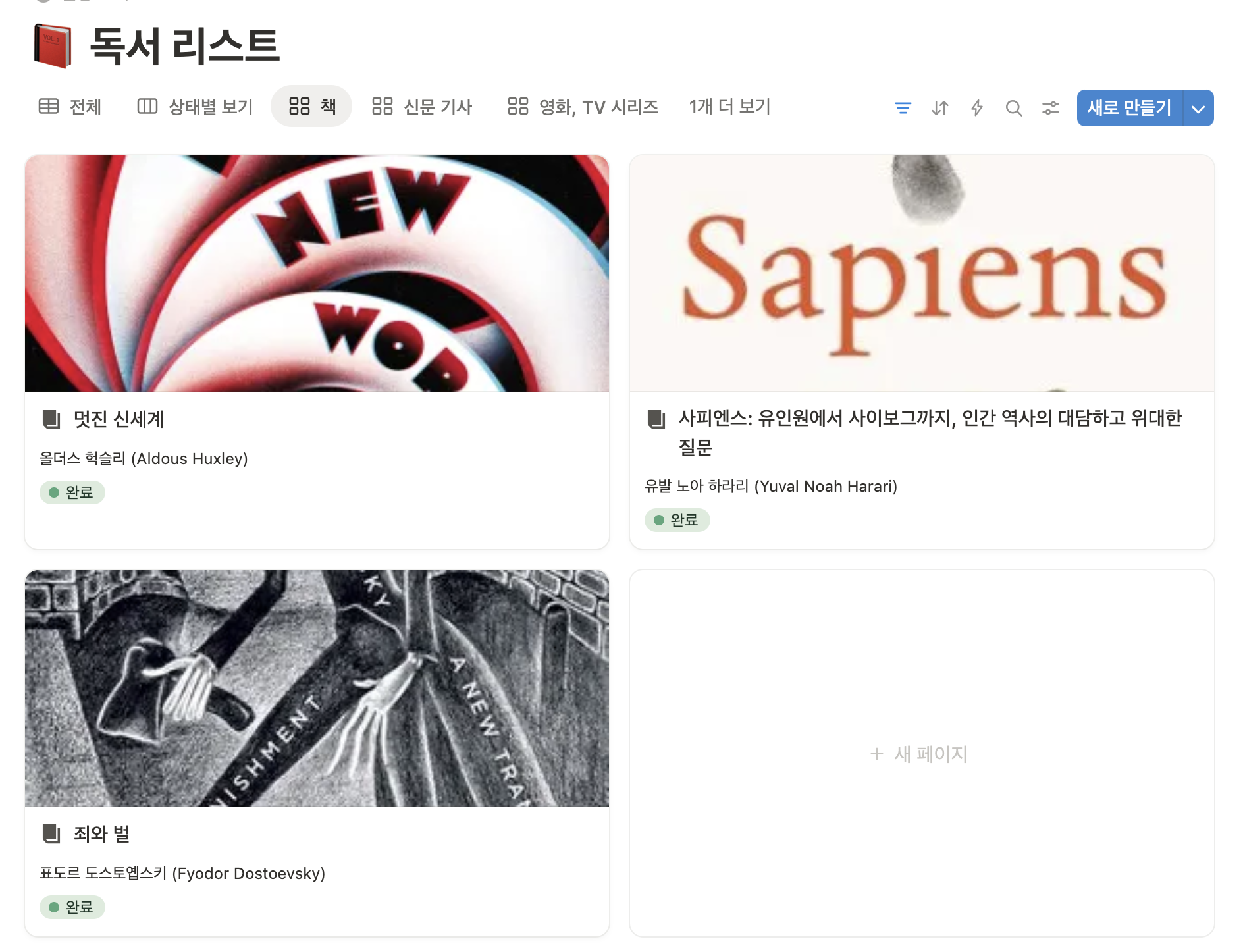예를 들어 독서 리스트를 표(Table)로 입력했다가 갤러리(Gallery)로 바꾸면 표지 이미지가 크게 보이며 전혀 다른 경험이 됩니다. 같은 데이터라도 뷰만 바꾸면 활용이 크게 달라지죠.